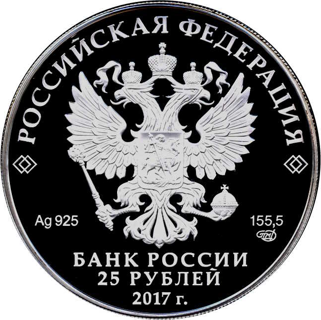 Описание: На аверсі монети зображено рельєфний герб Російської Федерації. Є написи: «РОССИЙСКАЯ ФЕДЕРАЦИЯ» (РОСІЙСЬКА ФЕДЕРАЦІЯ), «БАНК РОССИИ» (БАНК РОСІЇ), номінал монети — «25 РУБЛЕЙ» (25 РУБЛІВ) і рік — «2017», позначення металу відповідно до періодичної системи елементів Д. І. Менделєєва, проба, торгова марка Московського монетного двору та вміст дорогоцінного металу.