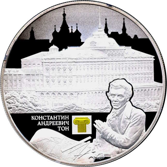 Описание: На дзеркальному полі диска — рельєфне зображення Великого Кремлівського палацу на тлі архітектурного комплексу Червоної площі, на передньому плані праворуч — рельєфний портрет К. А. Тона, ліворуч — технічний малюнок Храму Христа Спасителя, над малюнком — напис у три рядки «КОНСТАНТИН АНДРЕЕВИЧ ТОН» та кольорове зображення капітеля іонічного ордера.