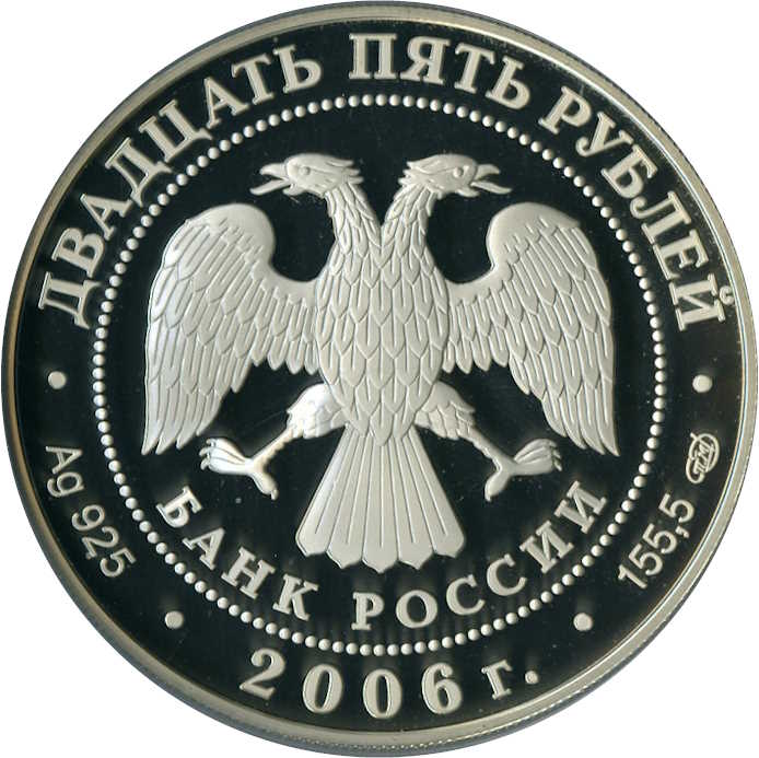 Описание: У центрі — емблема Банку Росії [двоголовий орел із розпростертими крилами, нижче — напівкруглий напис — «БАНК РОССИИ» (БАНК РОСІЇ)] в обрамленні кола з крапок і написів по краю: зверху — «ДВАДЦАТЬ ПЯТЬ РУБЛЕЙ» (ДВАДЦЯТЬ П'ЯТЬ РУБЛІВ), внизу – рік випуску «2006», літери ліворуч позначають метал і пробу, праворуч – вміст дорогоцінного металу і знак монетного двору.