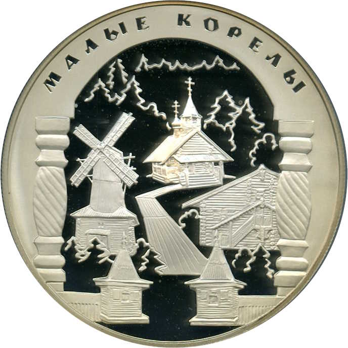 Описание: У рамці з двох дерев'яних різьблених колон, розташованих по обидва боки, та двох вхідних веж внизу — зображення вітряка ліворуч, двоповерхового селянського будинку праворуч, церкви та дерев'яного накриття як пішохідної доріжки в центрі, на задньому плані — ділянка лісу. Напис у верхній частині вздовж краю на матовій поверхні: «МАЛЫЕ КОРЕЛЫ» (MALYE KORELY).