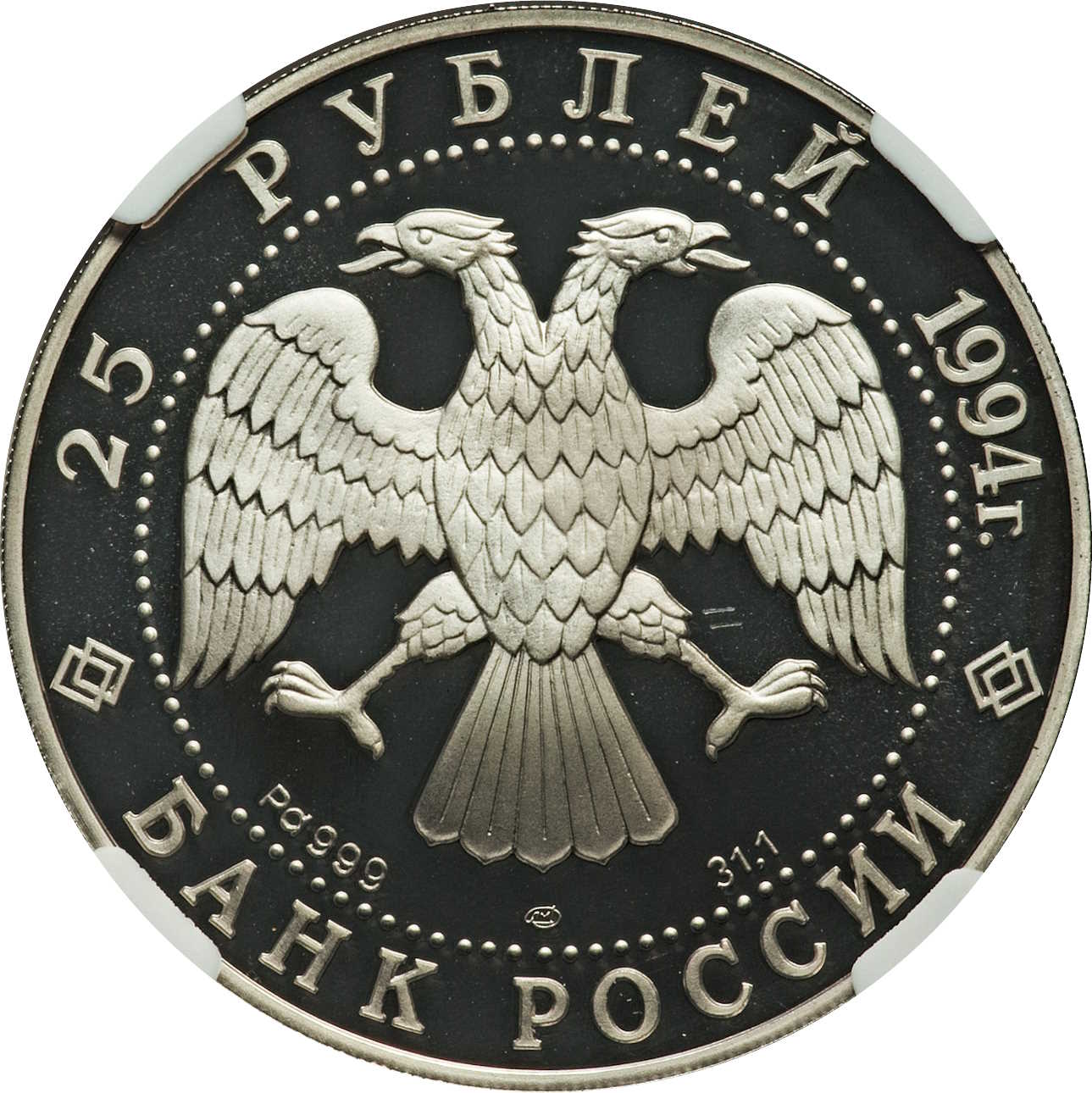Описание: У центрі — емблема Банку Росії (двоголовий орел, розроблений І. Білібіним), під нею ліворуч — позначення металу та проба, у центрі — знак монетного двору, праворуч — вміст дорогоцінного металу. Написи вздовж обідка обрамлені колом з крапок: зверху — «25 рублів 1994», знизу — «БАНК РОСІЇ».