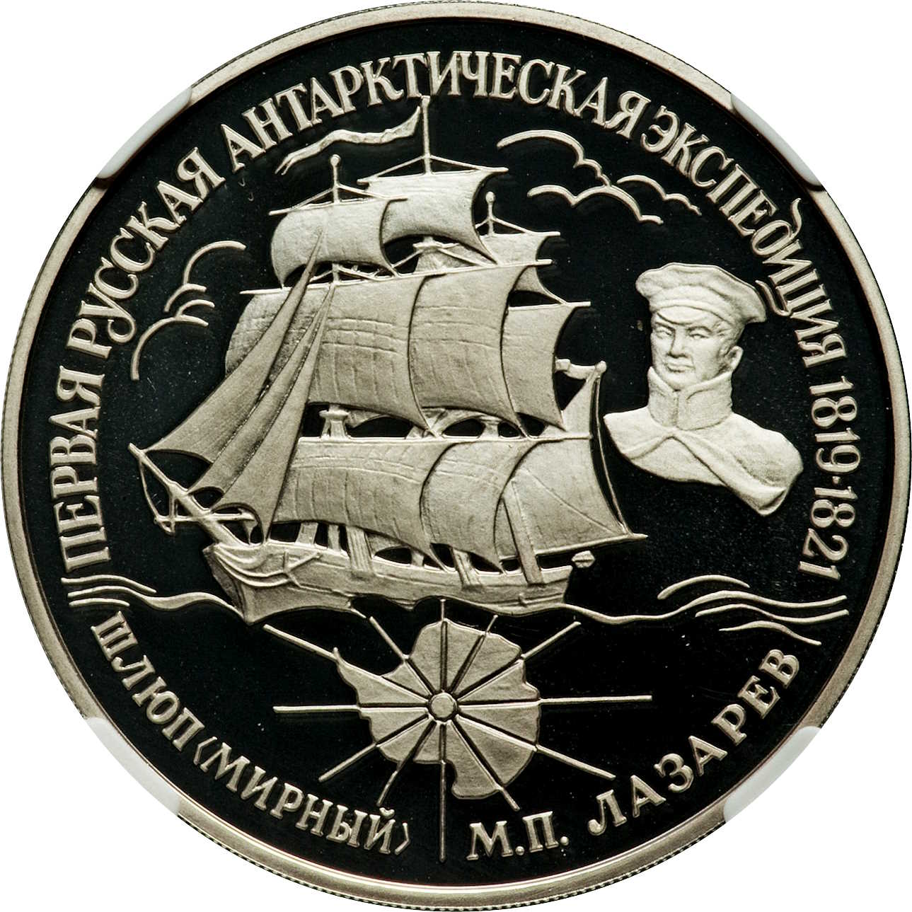 Описание: Шлюп «Мирний», праворуч — портрет М. П. Лазарева, внизу — карта Антарктиди, написи по краю: вгорі — «ПЕРВАЯ РУССКАЯ АНТАРКТИЧЕСКАЯ ЭКСПЕДИЦИЯ 1819-1821» (ПЕРША РОСІЙСЬКА АНТАРКТИЧЕСКАЯ ЕКСПЕДИЦІЯ 1819-1821), внизу — «ШЛЮП «МИРНЫЙ» М.П. ЛАЗАРЕВ» (ШЛЮП «МИРНИЙ» М. П. ЛАЗАРЕВ).