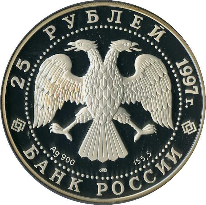 Описание: Двоголовий орел, створений художником І. Білібіним. Написи по краю: зверху — «25 РУБЛЕЙ 1997 г.» (25 РУБЛІВ 1997), знизу — «БАНК РОССИИ» (БАНК РОСІЇ). Літери нижче позначають металевий знак, пробу, вміст дорогоцінного металу та знак монетного двору.