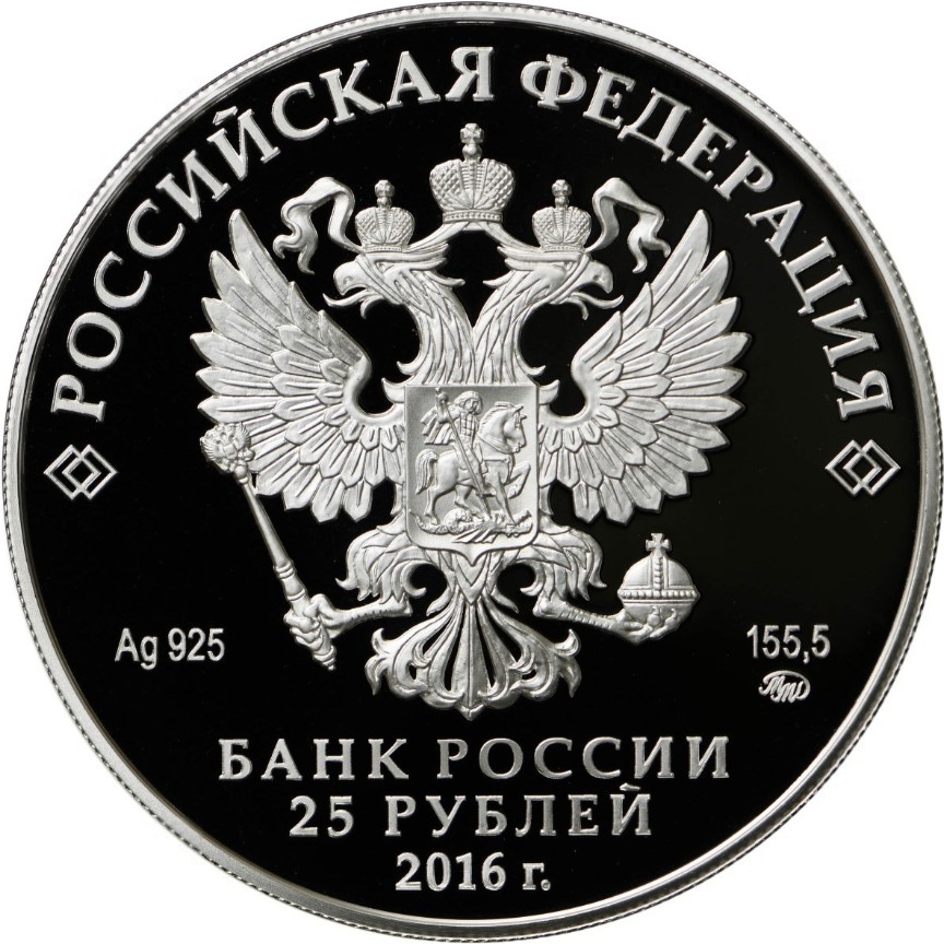 Описание: На дзеркальному полі диска – рельєфне зображення Державного герба Російської Федерації, над ним – напівкругла напис по колу: «РОССИЙСКАЯ ФЕДЕРАЦИЯ» (РОСІЙСЬКА ФЕДЕРАЦІЯ), обрамлена з обох боків подвійними ромбами, нижче під гербом: ліворуч – позначення дорогоцінного металу та його проби, праворуч – вміст дорогоцінного металу та торгова марка монетного двору, внизу по центру, у три рядки – напис: «БАНК РОССИИ» (БАНК РОСІЇ), номінал монети: «25 РУБЛЕЙ» (25 РУБЛІВ), рік випуску: «2016 г.» (2016).