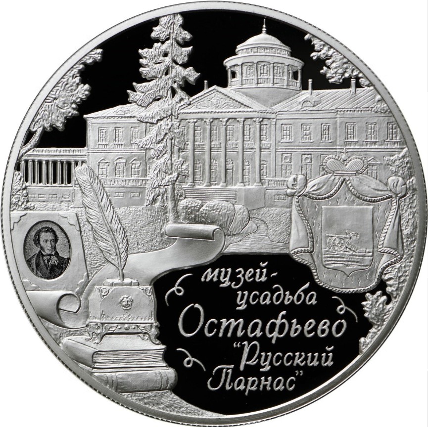 Описание: На дзеркальному полі диска рельєфне зображення музею-маєтку «Остаф'єво», на передньому плані зображення деяких атрибутів, пов'язаних з історією маєтку: книга з портретом О.С. Пушкіна, фрагмент пам'ятника М.М. Карамзіна (сувій, чорнильниця з пером, що стоїть на книгах), герб князів Вяземських, внизу на дзеркальному полі напис у п'ять рядків: «МУЗЕЙ-УСАДЬБА ОСТАФЬЕВО «РУССКИЙ ПАРНАС»» (МУЗЕЙ-САДИБА ОСТАФЬЄВО «РУСЬКИЙ ПАРНАС»).