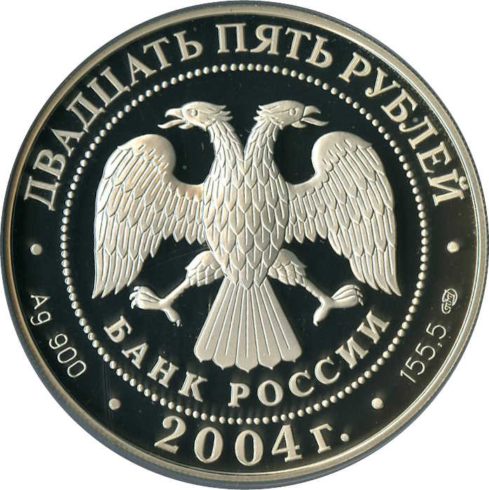 Описание: У центрі — емблема Банку Росії [двоголовий орел зі спущеними крилами, нижче — напівкруглий напис — «БАНК РОССИИ» (БАНК РОСІЇ)], обрамлена колом з крапок і написів по краю: зверху — «ДВАДЦАТЬ ПЯТЬ РУБЛЕЙ» (ДВАДЦЯТЬ П'ЯТЬ РУБЛІВ), внизу – рік випуску «2004», літери ліворуч позначають метал і пробу, праворуч – вміст дорогоцінного металу і знак монетного двору.