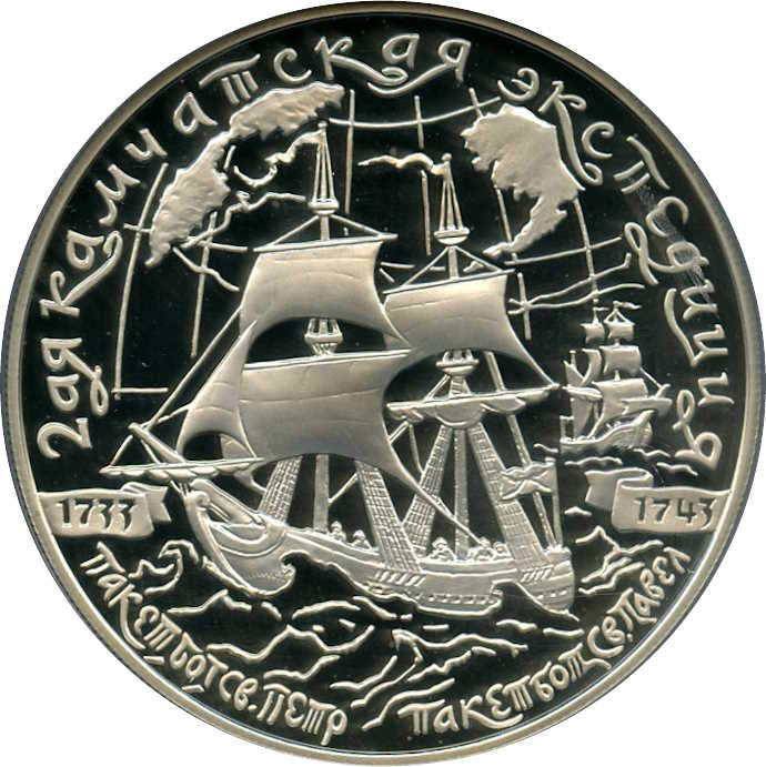 Описание: Парусне судно на тлі карти, ліворуч і праворуч від нього — дати на стрічці «1733» «1743», ліворуч вгорі — контури півостровів Камчатка і Чукотка, праворуч — північно-західне узбережжя Північної Америки, нижче — парусне судно. Написи по краю: вгорі – «2 ая КАМЧАТСКАЯ ЭКСПЕДИЦИЯ» (2-га Камчатська експедиція), внизу ліворуч – «ПАКЕТБОТ СВ.ПЁТР» (Пакетбот Св. Петро), праворуч – «ПАКЕТБОТ СВ.ПАВЕЛ» (Пакетбот Св. Павло).