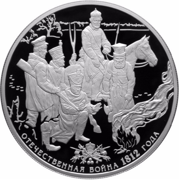 Описание: На дзеркальному полі монетного диска — група з чотирьох солдатів зі зброєю, одягнених у форму різних родів військ, які брали участь у Вітчизняній війні 1812 року, праворуч по краю — фігура коня, на задньому плані ліворуч — поселення, праворуч — дим від обгорілих руїн. Внизу - каска над схрещеною зброєю, прапорами та армійським спорядженням, під ними - напис по краю: «ОТЕЧЕСТВЕННАЯ ВОЙНА 1812 ГОДА» (ВІЙНА 1812 РОКУ).