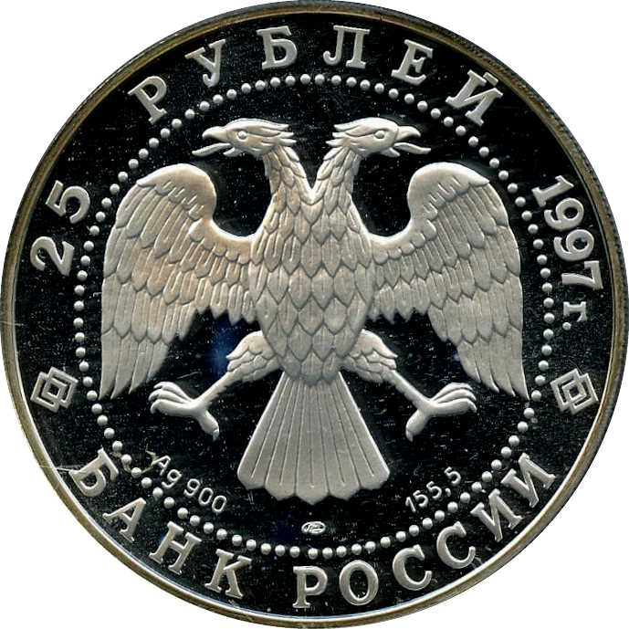 Описание: Двоголовий орел, створений художником І. Білібіним. Написи по краю: зверху — «25 РУБЛЕЙ 1997 г.» (25 РУБЛІВ 1997), знизу — «БАНК РОССИИ» (БАНК РОСІЇ). Літери нижче позначають металевий знак, пробу, вміст дорогоцінного металу та знак монетного двору.