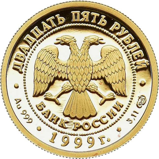 Описание: У центрі — емблема Банку Росії (двоголовий орел, розроблений І. Білібіним), нижче — напівкруглий напис «БАНК РОССИИ» (БАНК РОСІЇ), обрамлений колом з крапок, а по краю — написи: зверху — «ДВАДЦАТЬ ПЯТЬ РУБЛЕЙ» (ДВАДЦЯТЬ П'ЯТЬ РУБЛІВ), внизу — «1999», літери ліворуч позначають метал і пробу, праворуч — вміст дорогоцінного металу і знак монетного двору.