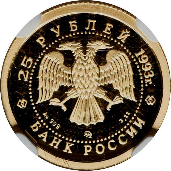 Описание: У центрі — емблема Банку Росії (двоголовий орел, розроблений І. Білібіним), під нею літери, що позначають метал, пробу, знак монетного двору та вміст дорогоцінного металу. Написи по краю, обрамлені колом з крапок: зверху — «25 РУБЛЕЙ 1993 г.» (25 РУБЛІВ 1993), знизу — «БАНК РОССИИ» (БАНК РОСІЇ).