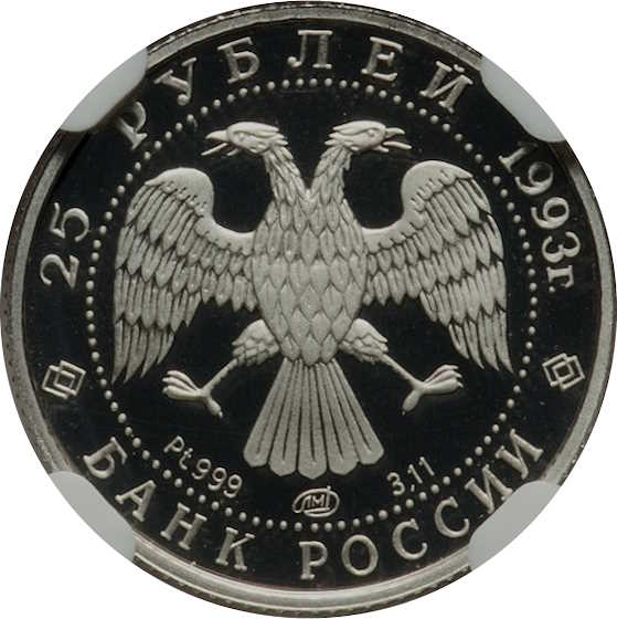 Описание: У центрі — емблема Банку Росії (двоголовий орел, розроблений І. Білібіним), нижче ліворуч — позначка металу та проба, у центрі — знак монетного двору, праворуч — вміст дорогоцінного металу. Написи вздовж обідка обрамлені колом з крапок: зверху — «25 рублів 1993», знизу — «БАНК РОСІЇ».