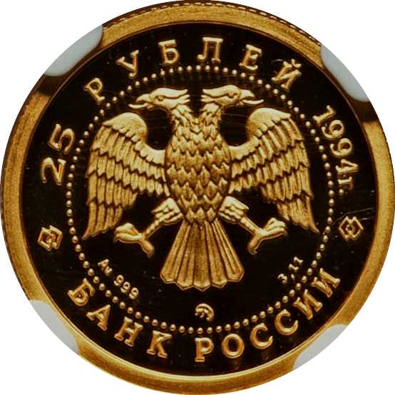 Описание: Двоголовий орел (за ескізом І. Білібіна), літери під ним позначають метал, пробу, знак монетного двору та вміст дорогоцінного металу. Написи по краю: зверху — «25 РУБЛЕЙ 1994 г.» (25 РУБЛІВ 1994), знизу — «БАНК РОССИИ» (БАНК РОСІЇ).