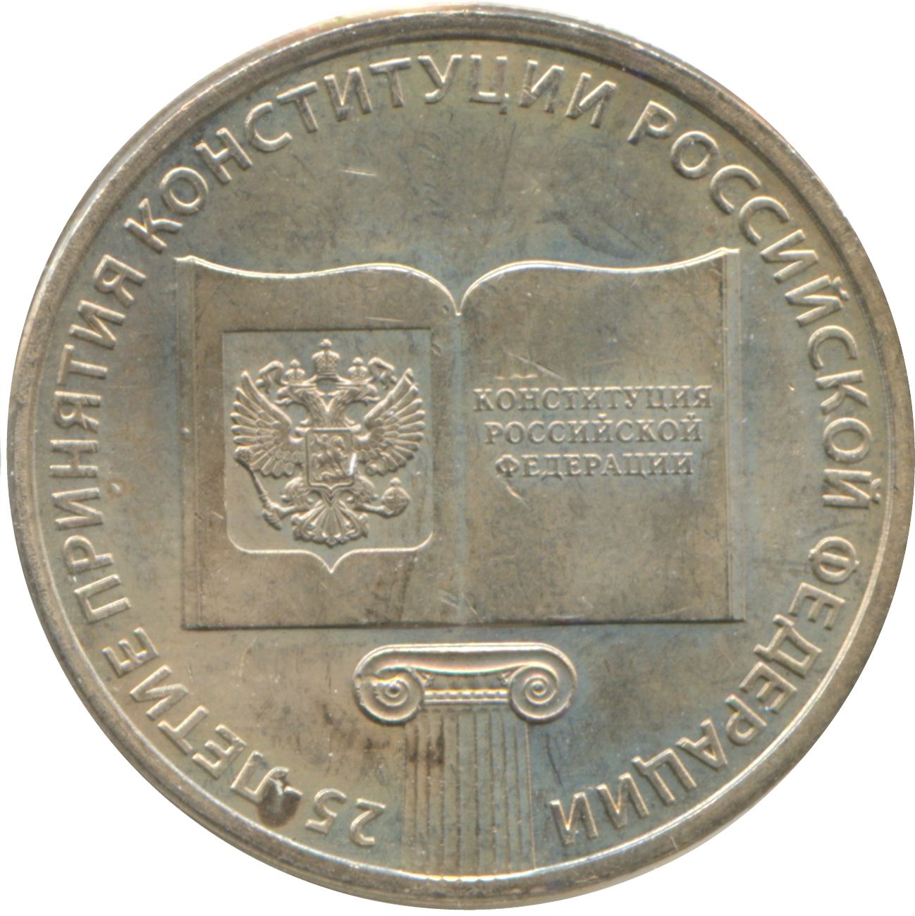 Описание: Рельєфне зображення розгорнутої книги з гербом Російської Федерації, зображеним на лівій сторінці, та трирядковим написом «КОНСТИТУЦИЯ РОССИЙСКОЙ ФЕДЕРАЦИИ» (КОНСТИТУЦІЯ РОСІЙСЬКОЇ ФЕДЕРАЦІЇ), вигравіруваним на правій сторінці; під книгою зображено верхню частину іонічної колони з капітелем. Нарешті, по колу розміщено напис «25-ЛЕТИЕ ПРИНЯТИЯ КОНСТИТУЦИИ РОССИЙСКОЙ ФЕДЕРАЦИИ» (25-РІЧЧЯ ПРИЙНЯТТЯ КОНСТИТУЦІЇ РОСІЙСЬКОЇ ФЕДЕРАЦІЇ).