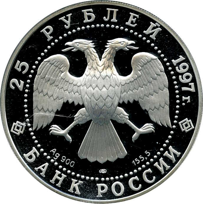 Описание: Двоголовий орел, створений художником І. Білібіним. Написи по краю: зверху — «25 РУБЛЕЙ 1997 г.» (25 РУБЛІВ 1997), знизу — «БАНК РОССИИ» (БАНК РОСІЇ). Літери нижче позначають металевий знак, пробу, вміст дорогоцінного металу та знак монетного двору.