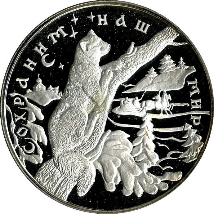 Описание: Зображення соболя на гілці дерева. На задньому плані — три коні, запряжені в ряд і тягнуть сани, ліворуч — російське село з церквою, зверху — небо з зірками та півмісяцем. Напис по краю: «СОХРАНИМ НАШ МИР» (ЗБЕРЕЖЕМО НАШ СВІТ).
