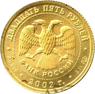 Описание: У центрі — емблема Банку Росії [двоголовий орел із опущеними крилами, нижче — напівкруглий напис «БАНК РОССИИ» (БАНК РОСІЇ)] в обрамленні кола з крапок і написів по краю: зверху — «ДВАДЦАТЬ ПЯТЬ РУБЛЕЙ» (ДВАДЦЯТЬ П'ЯТЬ РУБЛІВ), внизу - рік випуску «2002», літери ліворуч позначають метал і пробу, праворуч - вміст дорогоцінного металу і знак монетного двору.