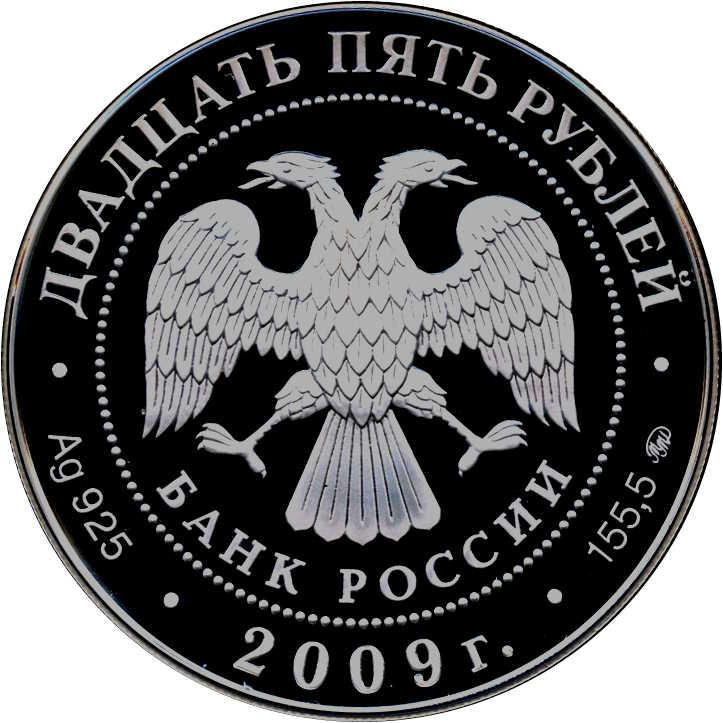 Описание: У центрі — емблема Банку Росії [двоголовий орел із розпростертими крилами, під ним — напівкруглий напис «БАНК РОССИИ» (БАНК РОСІЇ)], обрамлена колом з крапок і написів по краю — зверху: «ДВАДЦАТЬ ПЯТЬ РУБЛЕЙ» (ДВАДЦЯТЬ П'ЯТЬ РУБЛІВ), нижче: ліворуч - позначення дорогоцінного металу та його проби, в центрі - рік випуску «2009 г.» (2009), праворуч - вміст дорогоцінного металу та знак монетного двору.