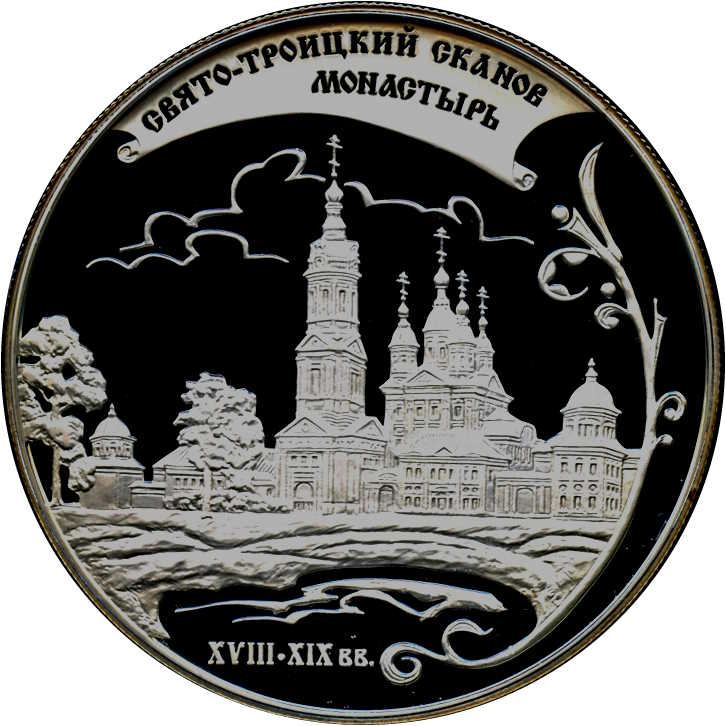 Описание: Архітектурний ансамбль монастиря, праворуч — стилізоване зображення гілки, знизу — дати: «XVIII-XIX вв.» (XVIII-XIX ст.), зверху на матовій поверхні сувою — напис у два рядки: «СВЯТО- ТРОИЦКИЙ СКАНОВ МОНАСТЫРЬ» (СВЯТО-ТРОЙЦЬКИЙ СКАНОВСЬКИЙ МОНАСТИР).