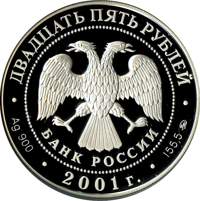 Описание: У центрі — емблема Банку Росії [двоголовий орел із опущеними крилами, нижче — напівкруглий напис — «БАНК РОССИИ» (БАНК РОСІЇ)] в обрамленні кола з крапками та написи по краю: у верхній частині — «ДВАДЦАТЬ ПЯТЬ РУБЛЕЙ» (ДВАДЦЯТЬ П'ЯТЬ РУБЛІВ), внизу — рік випуску «2001», літери ліворуч позначають метал і пробу, праворуч — вміст дорогоцінного металу і знак монетного двору.