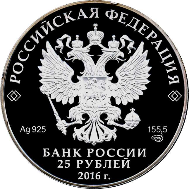 Описание: Рельєфне зображення державного герба Російської Федерації. Є написи: «РОССИЙСКАЯ ФЕДЕРАЦИЯ» (РОСІЙСЬКА ФЕДЕРАЦІЯ), «БАНК РОССИИ» (БАНК РОСІЇ), номінал монети — «25 РУБЛЕЙ» (25 РУБЛІВ) і рік — «2016», позначення металу відповідно до періодичної системи елементів Д.І. Менделєєва, проба, торгова марка монетного двору Санкт-Петербурга та вміст дорогоцінного металу.