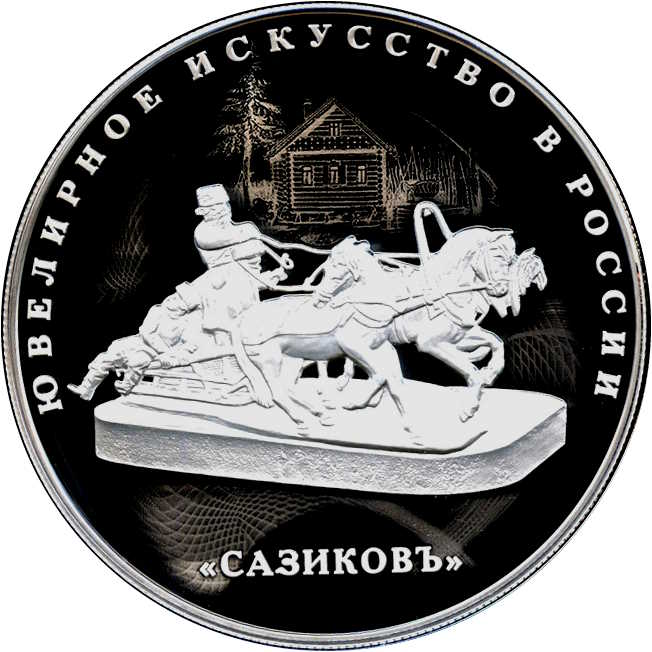 Описание: Рельєфне зображення скульптурної композиції «Трійка» ювелірної компанії «Сазіков» на тлі продукту іншої компанії — чорнильниці. Є написи: «ЮВЕЛИРНОЕ ИСКУССТВО В РОССИИ» (ЮВЕЛІРНЕ МИСТЕЦТВО В РОСІЇ) по колу зверху, «САЗИКОВЪ» (САЗИКОВ) знизу.