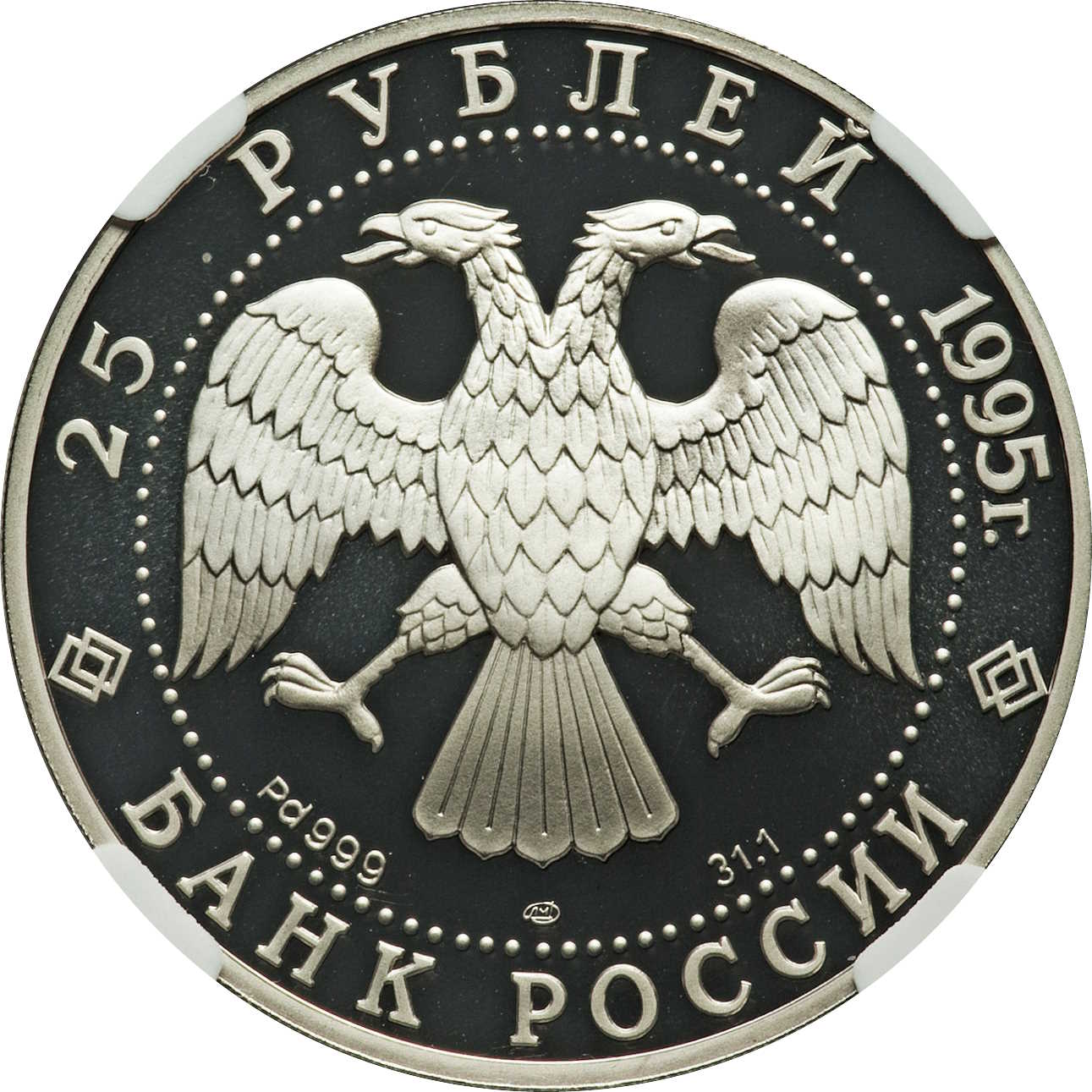 Описание: У центрі — емблема Банку Росії (двоголовий орел, створений І. Білібіним), під нею літери, що позначають метал, пробу, знак монетного двору та вміст дорогоцінного металу. Написи по краю, обрамлені колом з крапок: зверху — «25 РУБЛЕЙ 1995 г.» (25 РУБЛІВ 1995), знизу — «БАНК РОССИИ» (БАНК РОСІЇ).