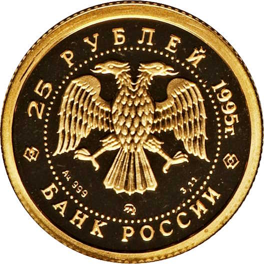 Описание: У центрі — емблема Банку Росії (двоголовий орел, створений І. Білібіним), під нею літери, що позначають метал, пробу, знак монетного двору та вміст дорогоцінного металу. Написи по краю, обрамлені колом з крапок: зверху — «25 РУБЛЕЙ 1995 г.» (25 РУБЛІВ 1995), знизу — «БАНК РОССИИ» (БАНК РОСІЇ).
