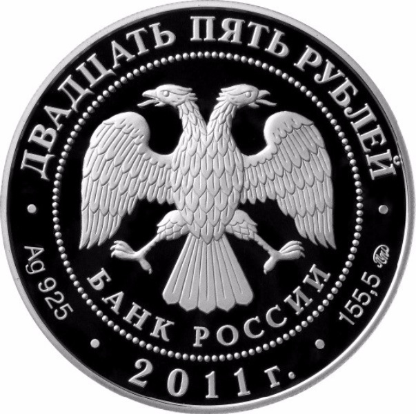 Описание: У центрі — емблема Банку Росії [двоголовий орел із опущеними крилами, під ним — напівкруглий напис «БАНК РОССИИ» (БАНК РОСІЇ)], обрамлена колом з крапок і написів по краю — зверху: «ДВАДЦАТЬ ПЯТЬ РУБЛЕЙ» (ДВАДЦЯТЬ П'ЯТЬ РУБЛІВ), нижче: ліворуч - позначення дорогоцінного металу та його проби, в центрі - рік випуску «2011 г.» (2011), праворуч - вміст дорогоцінного металу та знак монетного двору.