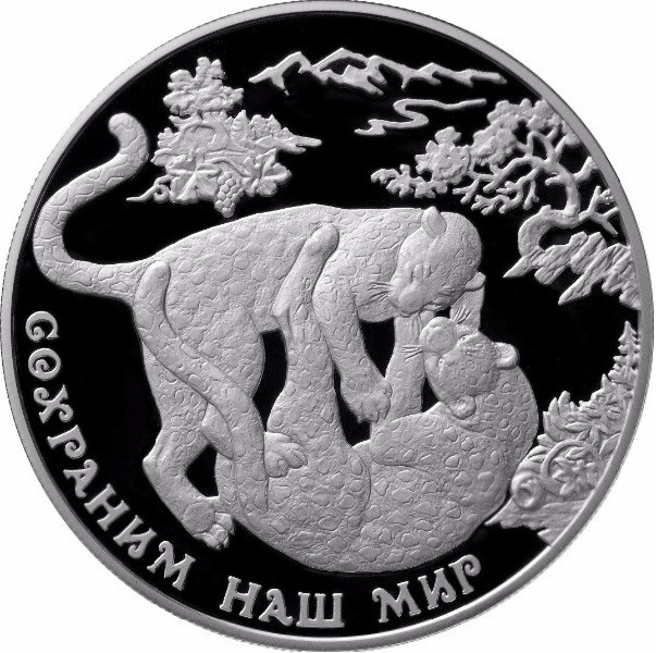 Описание: На передньому плані в центрі диска — зображення двох граючих леопардів, праворуч від них — кущ, на задньому плані ліворуч — кущі, праворуч — дерево, за ними — обриси далеких гір, внизу по краю — напівкруглий напис: «СОХРАНИМ НАШ МИР» (ЗБЕРЕЖЕМО НАШ СВІТ).