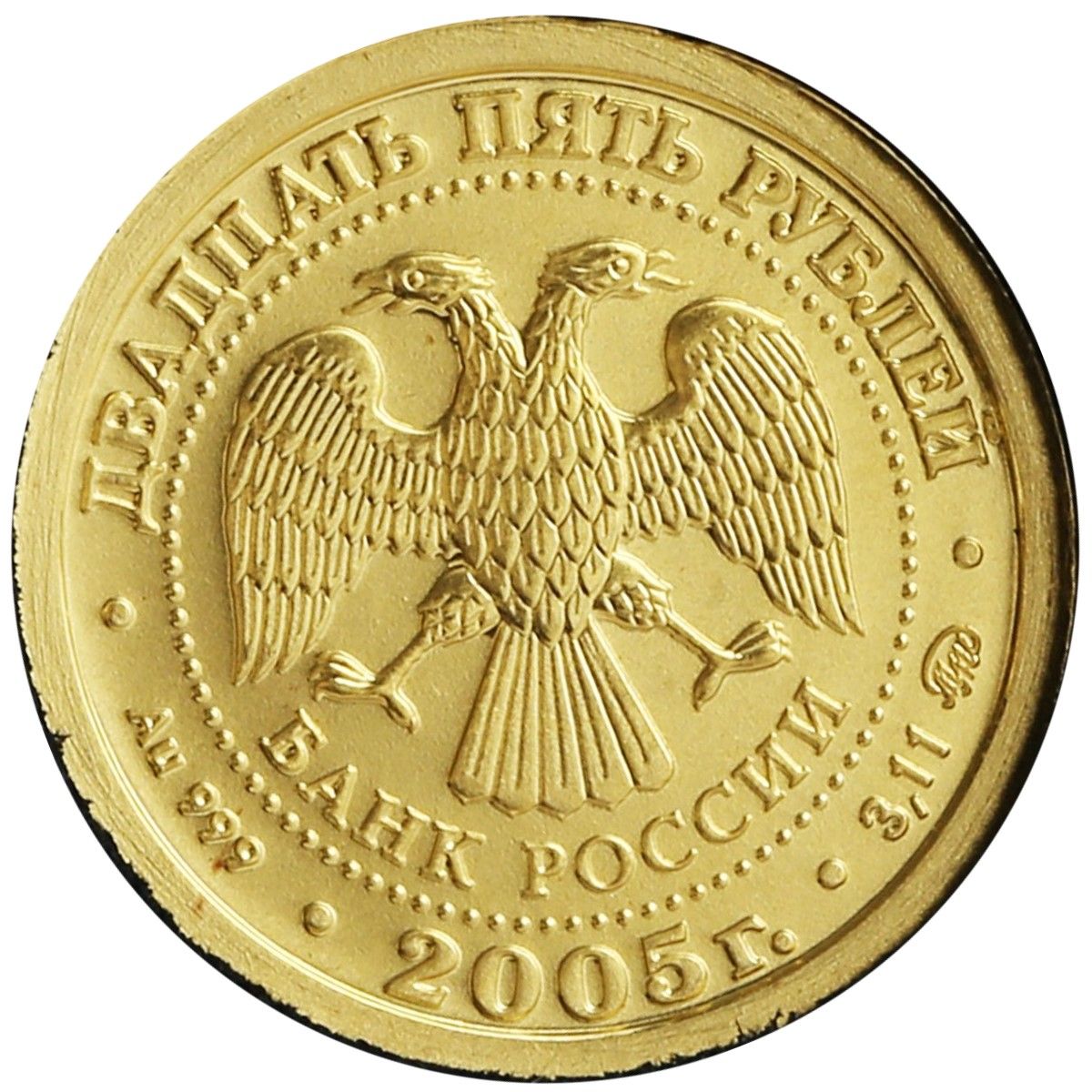 Описание: У центрі — емблема Банку Росії [двоголовий орел із розпростертими крилами, нижче — напівкруглий напис «БАНК РОССИИ» (БАНК РОСІЇ)], обрамлена колом з крапок і написів по краю: зверху — «ДВАДЦАТЬ ПЯТЬ РУБЛЕЙ» (ДВАДЦЯТЬ П'ЯТЬ РУБЛІВ), внизу – рік випуску «2005», літери ліворуч позначають метал і пробу, праворуч – вміст дорогоцінного металу і знак монетного двору.