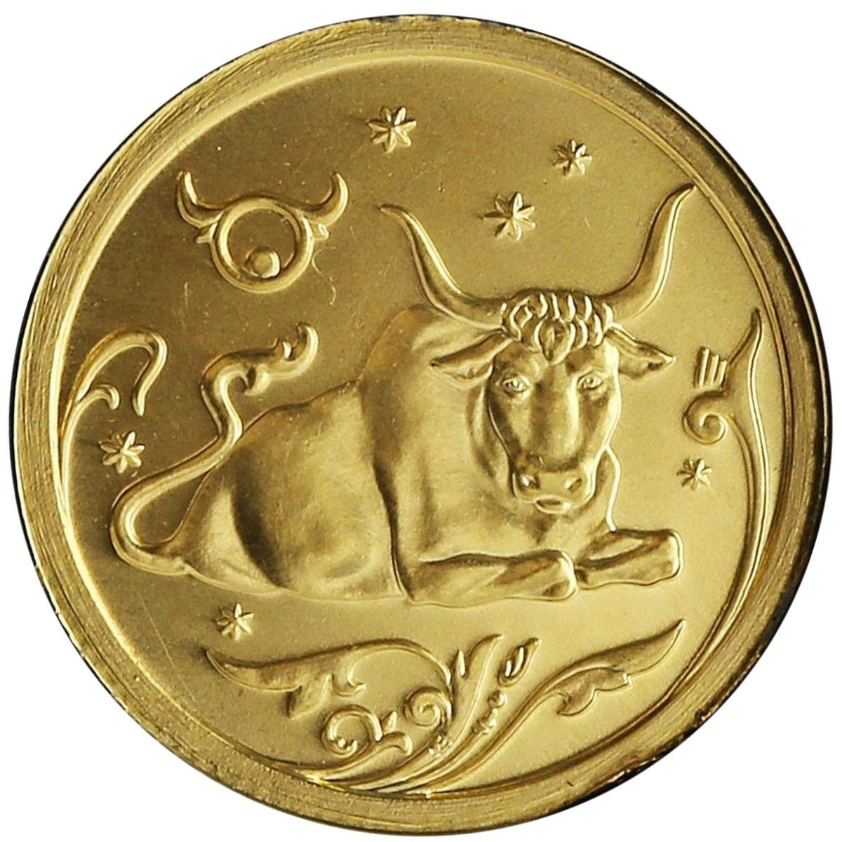 Описание: Зображення бика на тлі зірок, стилізованих гілок рослин і знака зодіакального сузір'я Тельця.