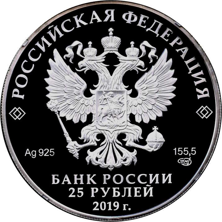 Описание: На аверсі монети зображено рельєфний герб Російської Федерації. Є написи: «РОССИЙСКАЯ ФЕДЕРАЦИЯ» (РОСІЙСЬКА ФЕДЕРАЦІЯ), «БАНК РОССИИ» (БАНК РОСІЇ), номінал монети — «25 РУБЛЕЙ» (25 РУБЛІВ) і рік — «2019», позначення металу відповідно до періодичної системи елементів Д. І. Менделєєва, проба, торгова марка Московського монетного двору та вміст дорогоцінного металу.