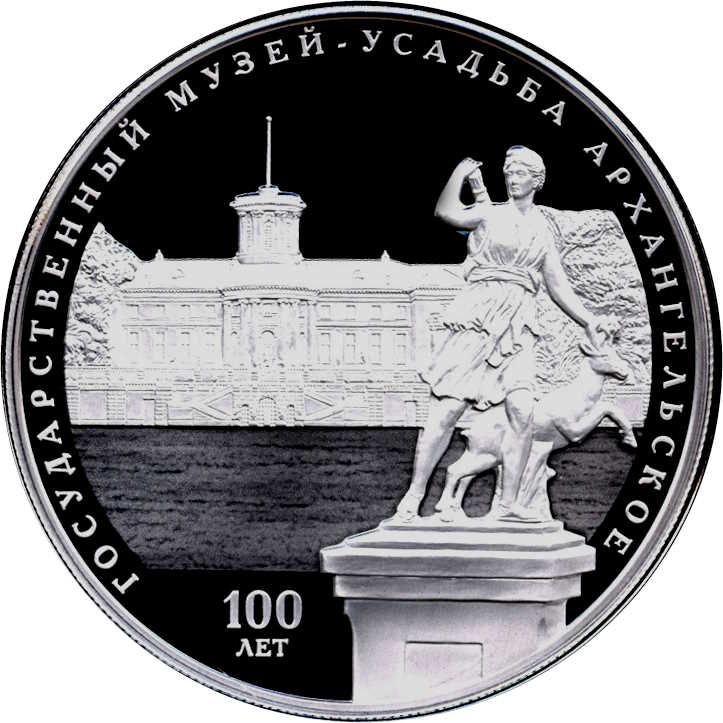 Описание: Рельєфні зображення південного фасаду палацу та садової скульптури Артеміда та олень; по периметру є напис: «ГОСУДАРСТВЕННЫЙ МУЗЕЙ-УСАДЬБА АРХАНГЕЛЬСКОЕ» (ДЕРЖАВНИЙ МУЗЕЙ-УСАДЬБА АРХАНГЕЛЬСЬКЕ), а внизу ліворуч — «100 ЛЕТ» (СТОРІЧЧЯ).