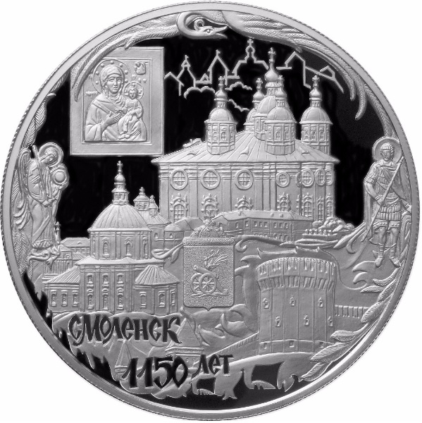 Описание: У центрі диска на дзеркальному полі — рельєфне зображення Соборної гори міста Смоленська, увінчаної Успенським собором, біля підніжжя гори на тлі церков — зображення герба міста Смоленська, ліворуч внизу — написи у два рядки: «1150 років» і «СМОЛЕНСЬК», , ліворуч вгорі на дзеркальному полі - зображення Смоленської ікони Божої Матері, праворуч - контури міських будівель, вгорі по краю - зображення міфічного птаха Гамаюна з розпростертими крилами, ліворуч і праворуч по краю - фігури архангела і воїна Меркурія.