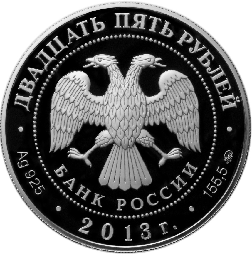 Описание: У центрі — емблема Банку Росії [двоголовий орел із розпростертими крилами, під ним — напівкруглий напис «БАНК РОССИИ» (БАНК РОСІЇ)], обрамлена колом з крапок і написів по краю — зверху: «ДВАДЦАТЬ ПЯТЬ РУБЛЕЙ» (ДВАДЦЯТЬ П'ЯТЬ РУБЛІВ), нижче: ліворуч - позначення дорогоцінного металу та його проби, в центрі - рік випуску «2013 г.» (2013), праворуч - вміст дорогоцінного металу та знак монетного двору.