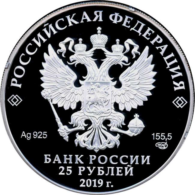 Описание: На аверсі монети зображено рельєфний герб Російської Федерації. Є написи: «РОССИЙСКАЯ ФЕДЕРАЦИЯ» (РОСІЙСЬКА ФЕДЕРАЦІЯ), «БАНК РОССИИ» (БАНК РОСІЇ), номінал монети — «25 РУБЛЕЙ» (25 РУБЛІВ) і рік — «2019», позначення металу відповідно до періодичної системи елементів Д. І. Менделєєва, проба, торгова марка Московського монетного двору та вміст дорогоцінного металу.