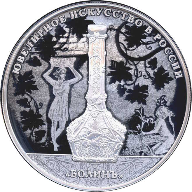 Описание: Рельєфне зображення ювелірного виробу, виготовленого компанією Bolin — срібний кришталевий глечик зі стилізованою композицією, оброблений лазером для матового покриття, на тлі інших виробів компанії; по колу є написи: «ЮВЕЛИРНОЕ ИСКУССТВО В РОССИИ» (ЮВЕЛІРНЕ МИСТЕЦТВО В РОСІЇ) вгорі та «БОЛИНЪ» (БОЛІН) внизу.