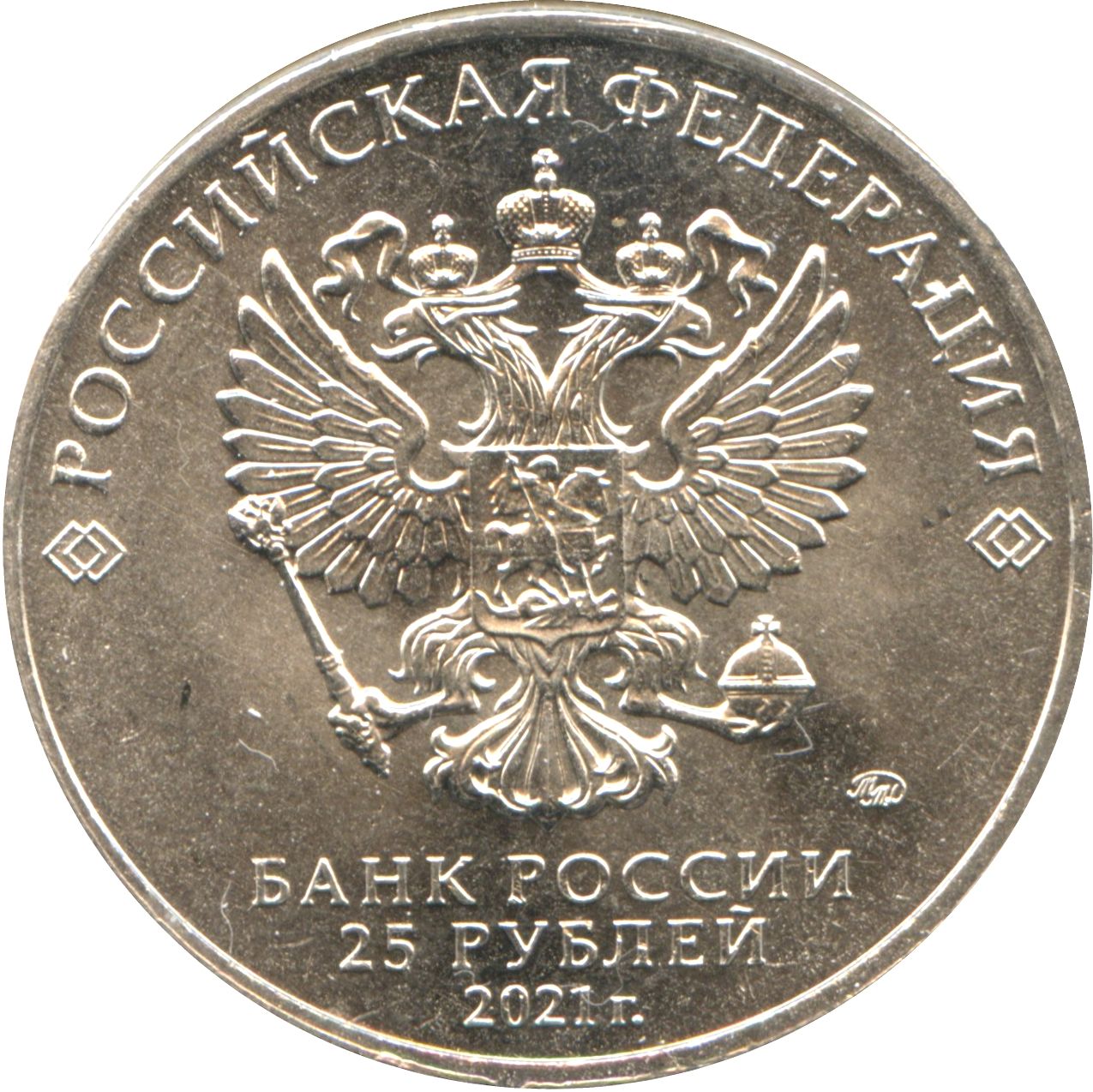 Описание: У центрі розміщено рельєфне зображення Державного герба Російської Федерації, а над ним — напівкруглий напис уздовж краю «РОССИЙСКАЯ ФЕДЕРАЦИЯ» (РОСІЙСЬКА ФЕДЕРАЦІЯ), обрамлений подвійними ромбами з обох боків, під емблемою, у три рядки, розміщено напис «БАНК РОССИИ» (БАНК РОСІЇ), номінал монети «25 РУБЛЕЙ» (25 РУБЛІВ) і рік випуску «2021 г.» (2021), а праворуч — знак монетного двору.