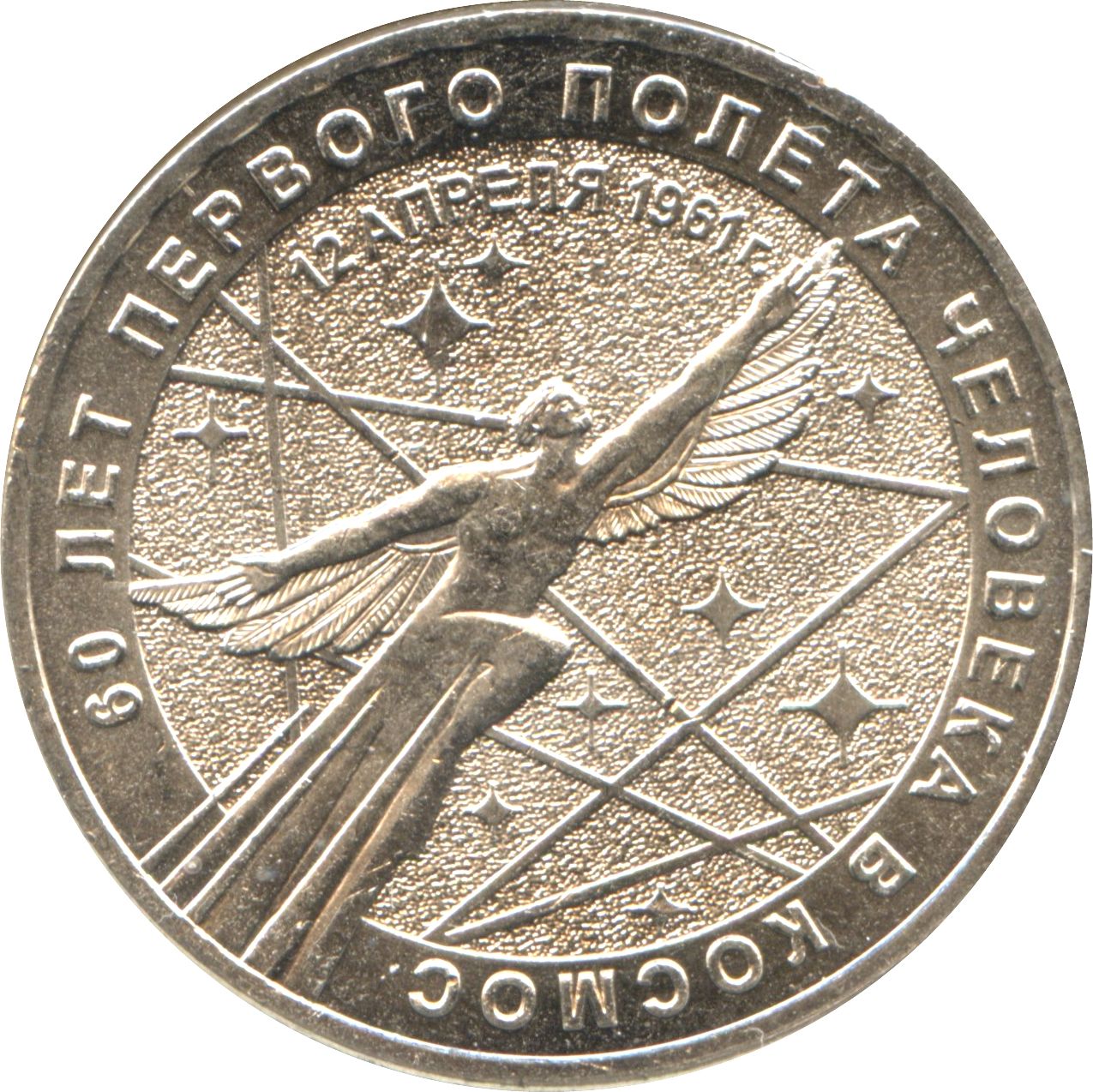 Описание: Рельєфне зображення літаючої крилатої людської фігури на тлі стилізованого зображення неба, повного зірок; є написи: «12 АПРЕЛЯ 1961 г.» (12 КВІТНЯ 1961 р.) у верхній частині вздовж внутрішнього краю та «60 ЛЕТ ПЕРВОГО ПОЛЕТА ЧЕЛОВЕКА В КОСМОС» (60-РІЧЧЯ ПЕРШОГО ПОЛІТУ ЛЮДИНИ В КОСМОС) на кільці.
