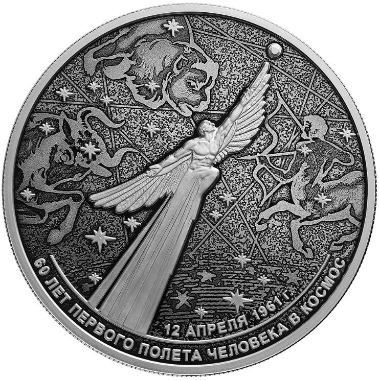 Описание: На дзеркальній поверхні диска зображено рельєфні зображення літаючої крилатої людської фігури та зірки на тлі стилізованих зображень неба, повного зірок і міфологічних істот — зодіакальних сузір’їв Тельця, Лева та Стрільця; нижче, вздовж краю, є написи: «12 АПРЕЛЯ 1961 г.» (12 КВІТНЯ 1961 р.) та «60 ЛЕТ ПЕРВОГО ПОЛЕТА ЧЕЛОВЕКА В КОСМОС» (60-РІЧЧЯ ПЕРШОГО ПОЛІТУ ЛЮДИНИ В КОСМОС).
