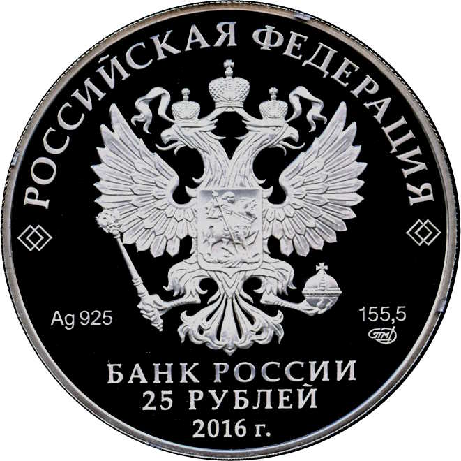 Описание: Рельєфне зображення державного герба Російської Федерації. Є написи: «РОССИЙСКАЯ ФЕДЕРАЦИЯ» (РОСІЙСЬКА ФЕДЕРАЦІЯ), «БАНК РОССИИ» (БАНК РОСІЇ), номінал монети — «25 РУБЛЕЙ» (25 РУБЛІВ) і рік — «2016», позначення металу відповідно до періодичної системи елементів Д.І. Менделєєва, проба, торгова марка монетного двору Санкт-Петербурга та вміст дорогоцінного металу.