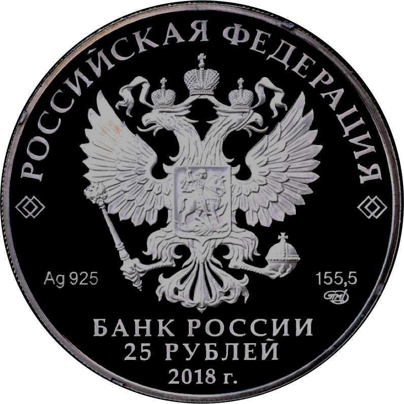 Описание: На аверсі монети зображено рельєфний герб Російської Федерації. Є написи: «РОССИЙСКАЯ ФЕДЕРАЦИЯ» (РОСІЙСЬКА ФЕДЕРАЦІЯ), «БАНК РОССИИ» (БАНК РОСІЇ), номінал монети — «25 РУБЛЕЙ» (25 РУБЛІВ) і рік — «2018», позначення металу відповідно до періодичної системи елементів Д. І. Менделєєва, проба, торгова марка Московського монетного двору та вміст дорогоцінного металу.