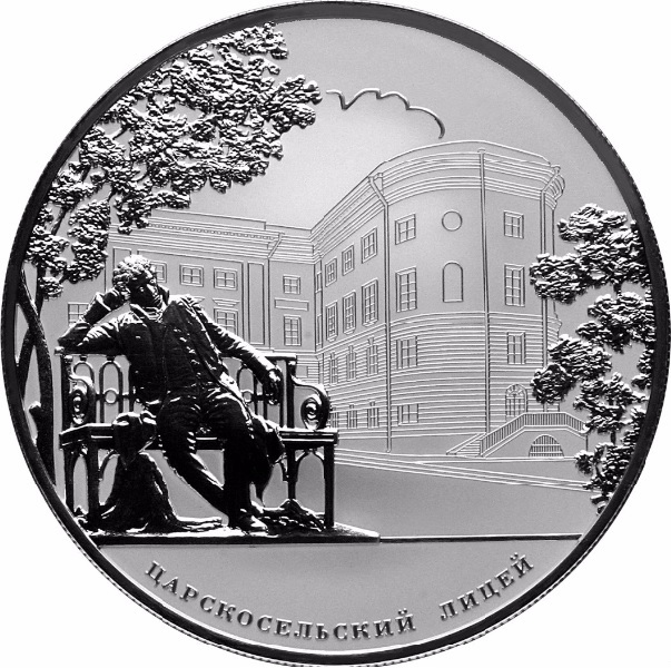 Описание: На матовому диску монети ліворуч — пам'ятник О. С. Пушкіну, який сидить у задумливій позі, спершись правим ліктем на спинку садової лавки, над ним — крона дерева, на задньому плані — праве крило будівлі ліцею, праворуч на обідку — крона дерева, нижче на обідку напис, виконаний технікою «пробного відбитка»: «ЦАРСКОСЕЛЬСКИЙ ЛИЦЕЙ» (ЦАРСЬКОСЕЛЬСЬКИЙ ЛІЦЕЙ).
