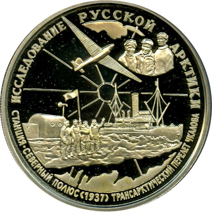 Описание: У верхній частині — літак на тлі карти арктичного узбережжя, праворуч — портрети Валерія Чкалова, Георгія Байдукова та Олександра Бєлякова, у центрі — криголам і група полярників на крижині (І. Д. Папанін, Ю. К. Федоров, П. П. Ширшов та Е. Т. Кренкель). Написи по краю: у верхній частині — «ИССЛЕДОВАНИЕ РУССКОЙ АРКТИКИ» (ДОСЛІДЖЕННЯ РОСІЙСЬКОЇ АРКТИКИ), у нижній частині — «СТАНЦІЯ «СЕВЕРНИЙ ПОЛЮС» <1937> ТРАНСАРКТИЧЕСКИЙ ПЕРЕЛЕТ ЧКАЛОВА» (СТАНЦІЯ «СЕВЕРНИЙ ПОЛЮС» <1937> ТРАНСАРКТИЧЕСКИЙ ПЕРЕЛЕТ ЧКАЛОВА).