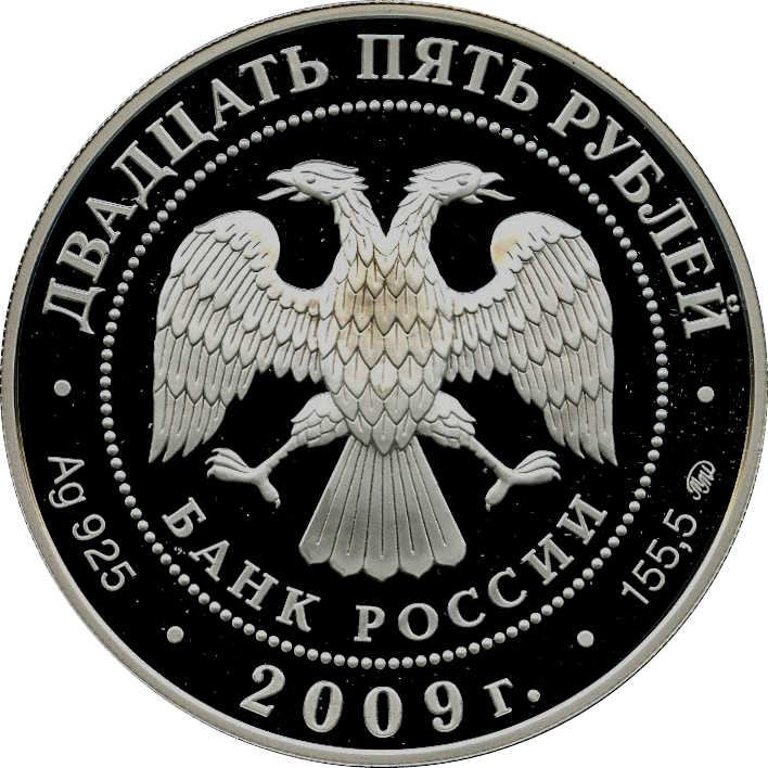 Описание: У центрі — емблема Банку Росії [двоголовий орел із розпростертими крилами, під ним — напівкруглий напис «БАНК РОССИИ» (БАНК РОСІЇ)], обрамлена колом з крапок і написів по краю — зверху: «ДВАДЦАТЬ ПЯТЬ РУБЛЕЙ» (ДВАДЦЯТЬ П'ЯТЬ РУБЛІВ), нижче: ліворуч - позначення дорогоцінного металу та його проби, в центрі - рік випуску «2009 г.» (2009), праворуч - вміст дорогоцінного металу та знак монетного двору.