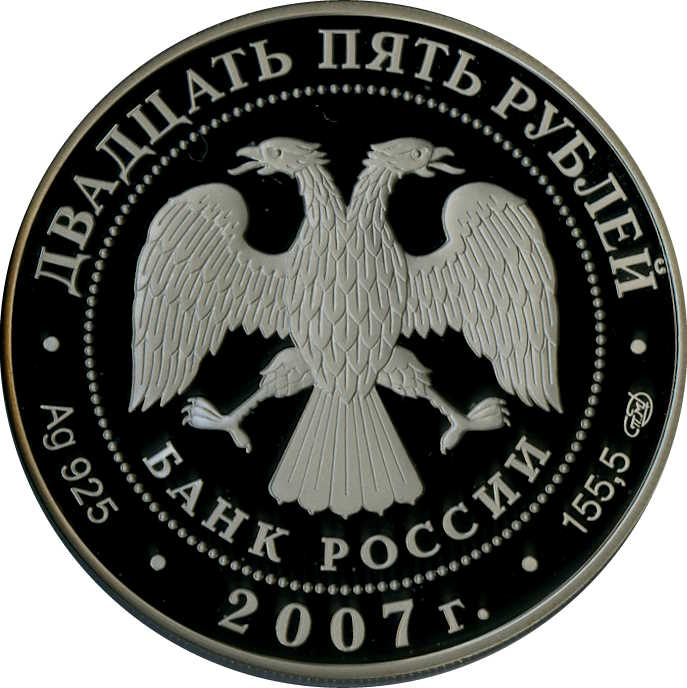 Описание: У центрі — емблема Банку Росії [двоголовий орел із розпростертими крилами, під ним — напівкруглий напис «БАНК РОССИИ» (БАНК РОСІЇ)], обрамлена колом з крапок, а по краю — написи: зверху: «ДВАДЦАТЬ ПЯТЬ РУБЛЕЙ» (ДВАДЦЯТЬ П'ЯТЬ РУБЛІВ), внизу: ліворуч – позначення дорогоцінного металу та його проби, в центрі – рік випуску «2007 г.» (2007), праворуч – вміст дорогоцінного металу та знак монетного двору.