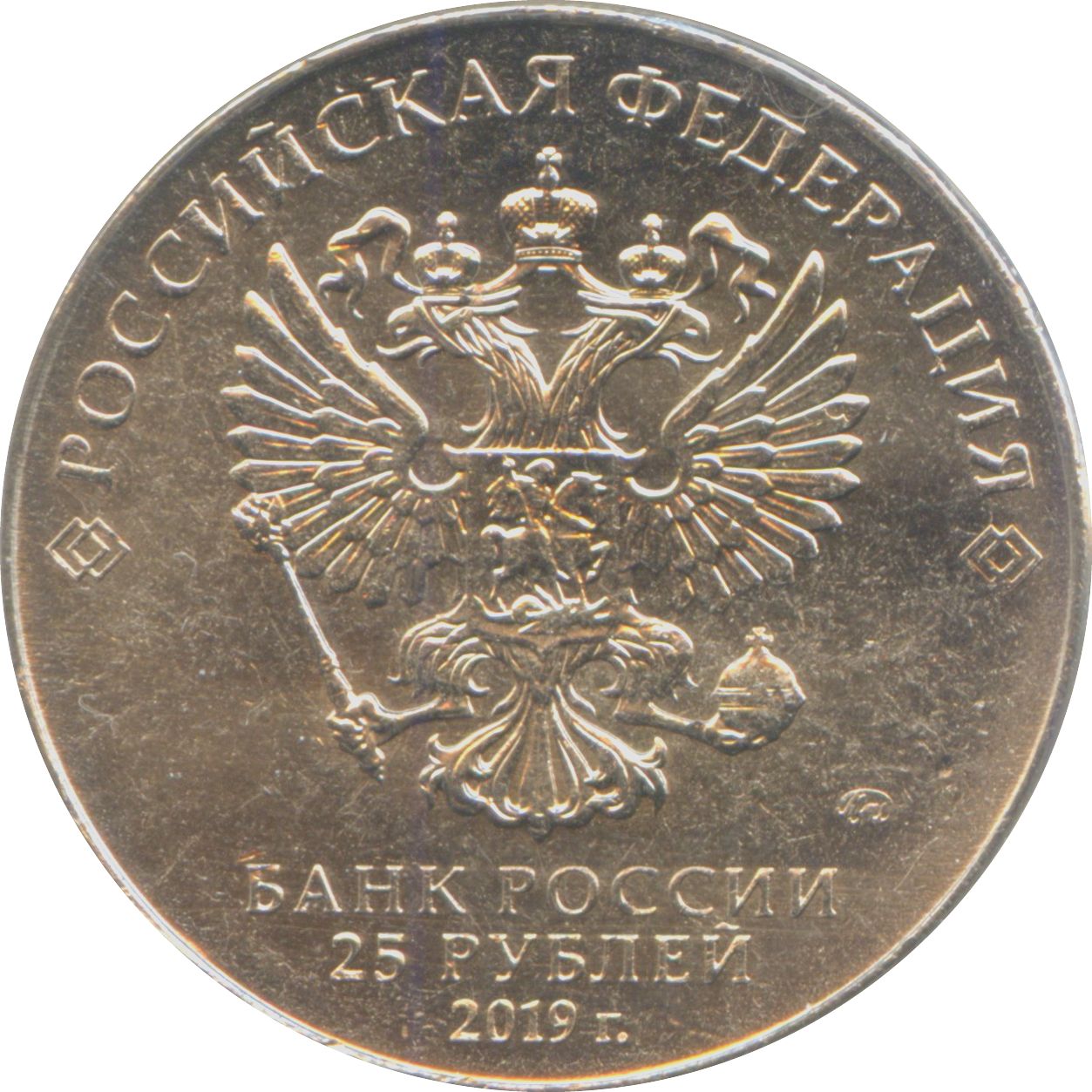 Описание: На аверсі монет зображено рельєфний герб Російської Федерації, над ним по верхньому колу напис «РОССИЙСКАЯ ФЕДЕРАЦИЯ» (РОСІЙСЬКА ФЕДЕРАЦІЯ), обрамлений з обох боків парними ромбами, праворуч — знак Московського монетного двору, а в центрі монет під гербом — трирядковий напис «БАНК РОССИИ» (БАНК РОСІЇ), номінал монети «25 РУБЛЕЙ» (25 РУБЛІВ), рік випуску «2019 г.» (2019).
