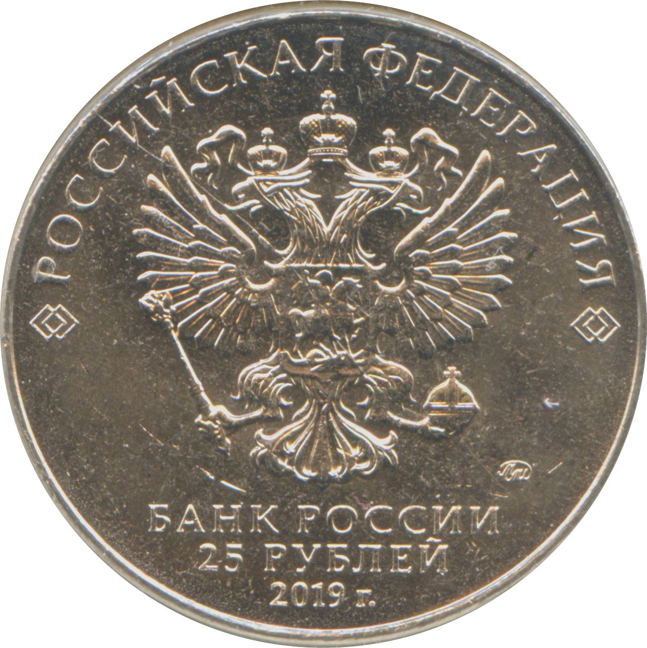 Описание: На аверсі монет зображено рельєфний герб Російської Федерації, над ним по верхньому колу напис «РОССИЙСКАЯ ФЕДЕРАЦИЯ» (РОСІЙСЬКА ФЕДЕРАЦІЯ), обрамлений з обох боків парними ромбами, праворуч — знак Московського монетного двору, а в центрі монет під гербом — трирядковий напис «БАНК РОССИИ» (БАНК РОСІЇ), номінал монети «25 РУБЛЕЙ» (25 РУБЛІВ), рік випуску «2019 г.» (2019).