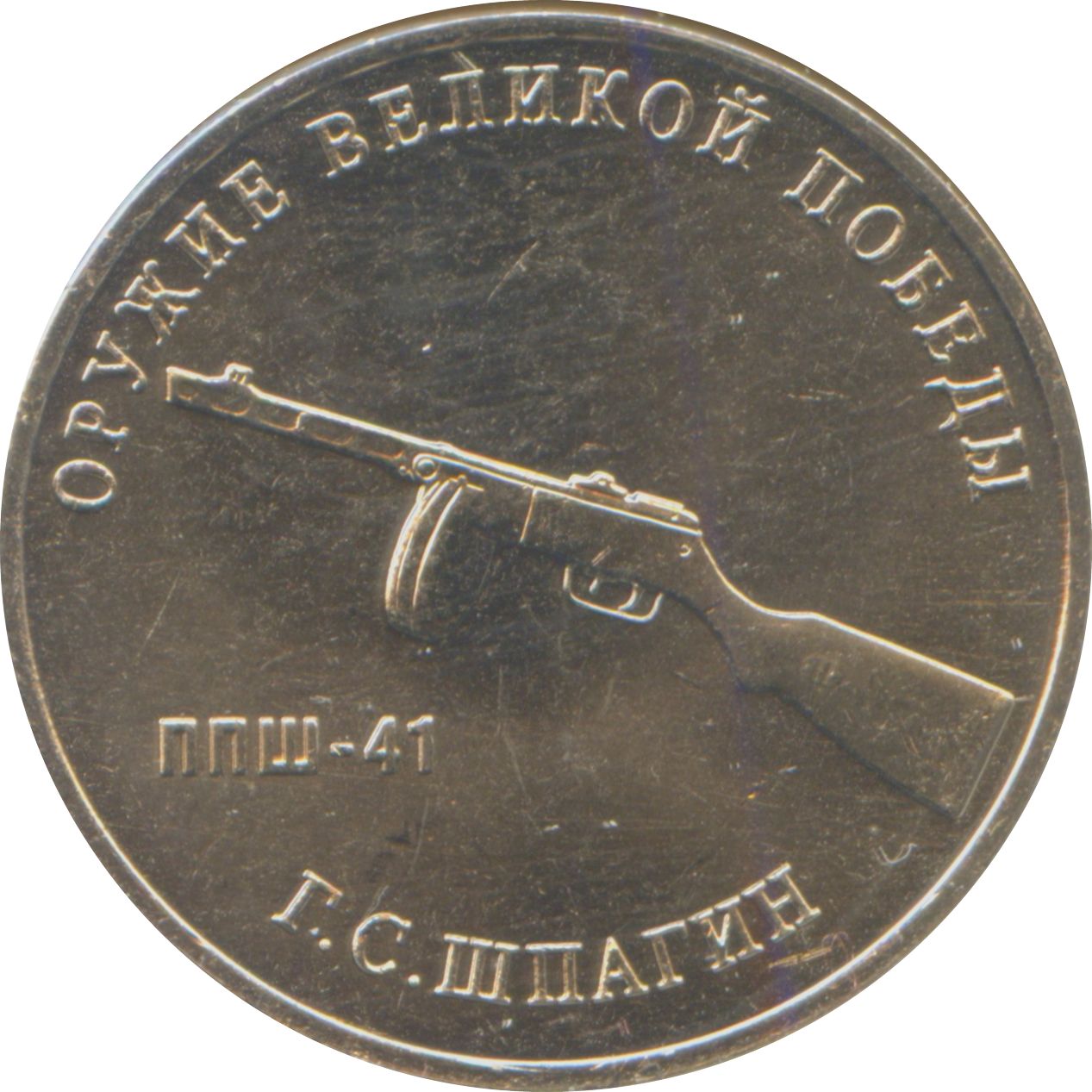 Описание: Зліва — рельєфне зображення пістолета-кулемета Шпагіна та напис «ППШ-41» (PPSh-41); по колу зверху — напис «ОРУЖИЕ ВЕЛИКОЙ ПОБЕДЫ» (ЗБРОЯ ВЕЛИКОЇ ПЕРЕМОГИ), а знизу — «Г.С. ШПАГИН» (ГЕОРГІЙ ШПАГІН) внизу.